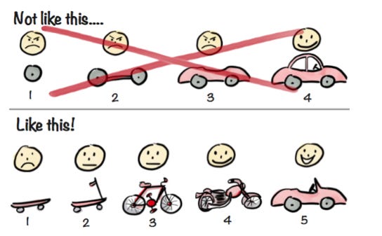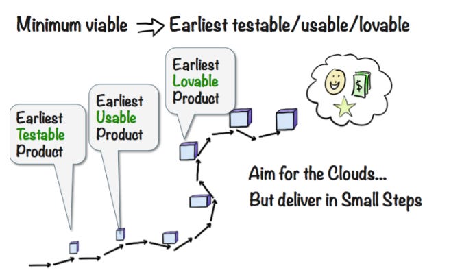 The visual below for what an MVP should look like, is one I revisit often. It's great because it reinforces the agile methodology of delivering early and often.