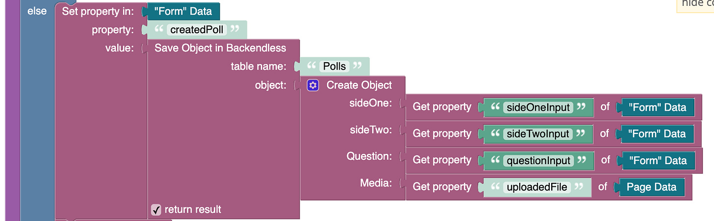 For example, here is an IF/ELSE snippet from the Poll Submission page where I am taking the user’s inputs, which are stored locally in “Form Data” and saving that entry as an object in the Polls database in the backend.